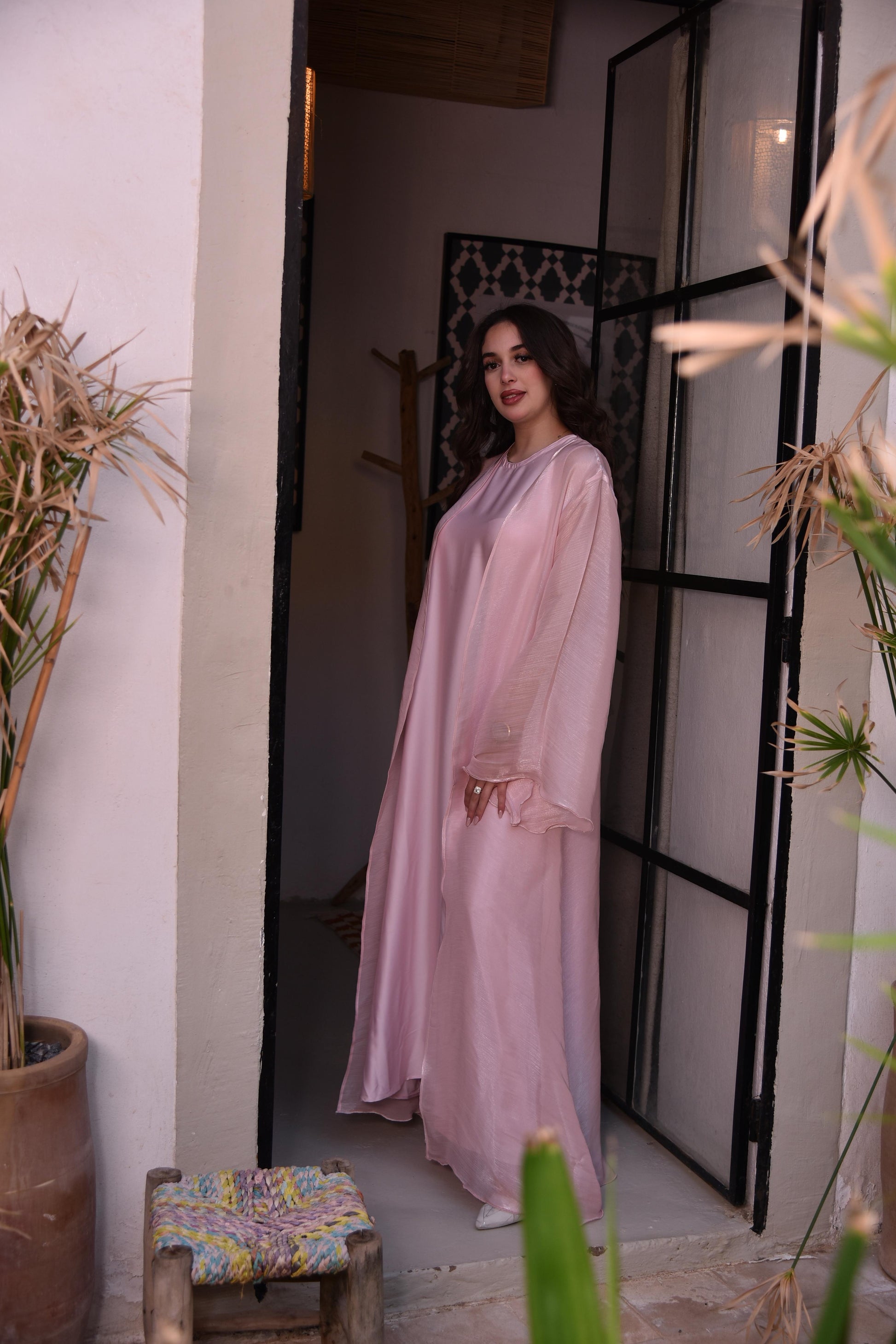 The flowy light-rose organza Abaya paired with our satin underdress is a timeless design in the world of Abayas truly emphasizing elengance and femininity. The sleeves remind us of spring flowers and butterflies