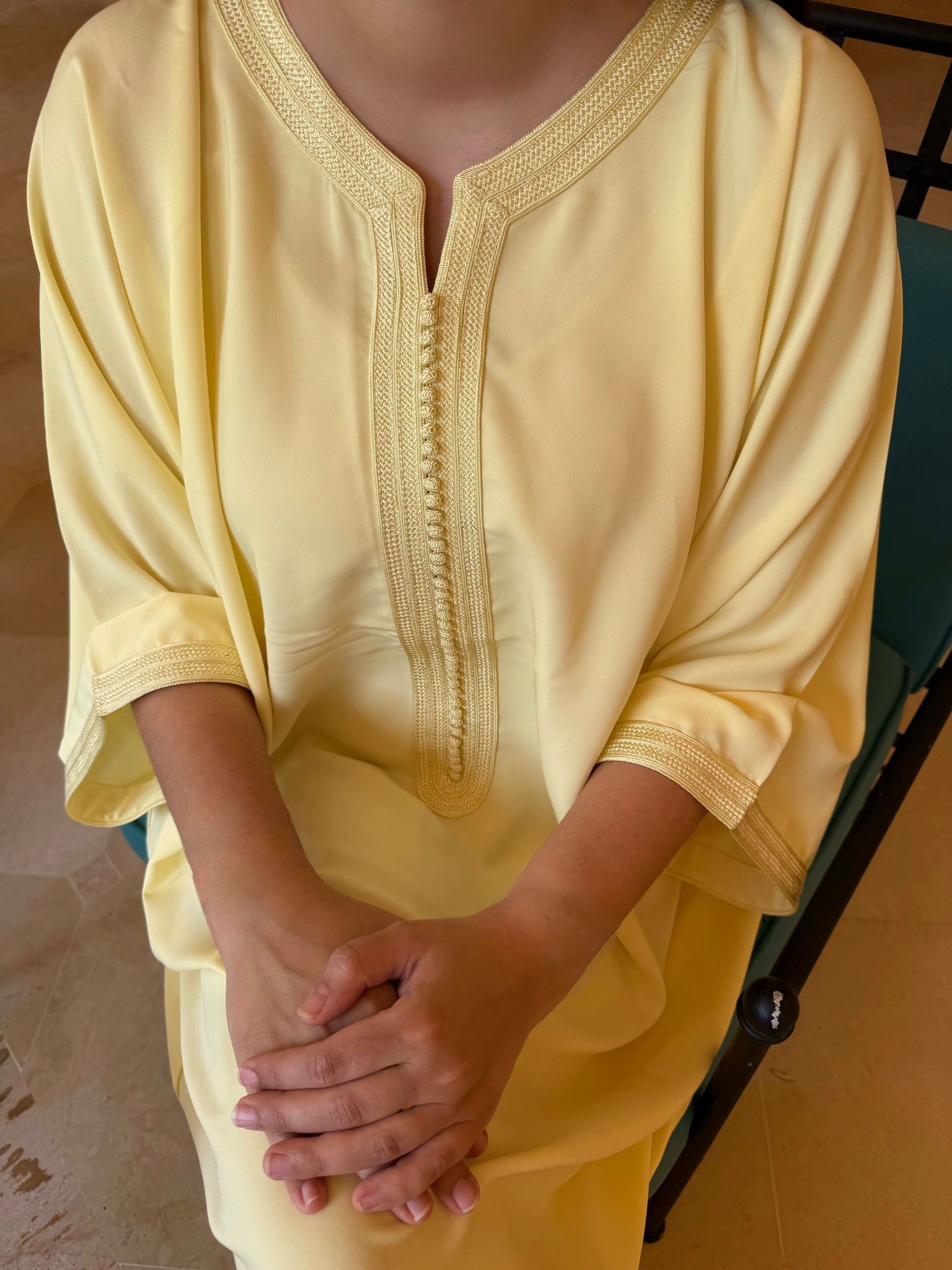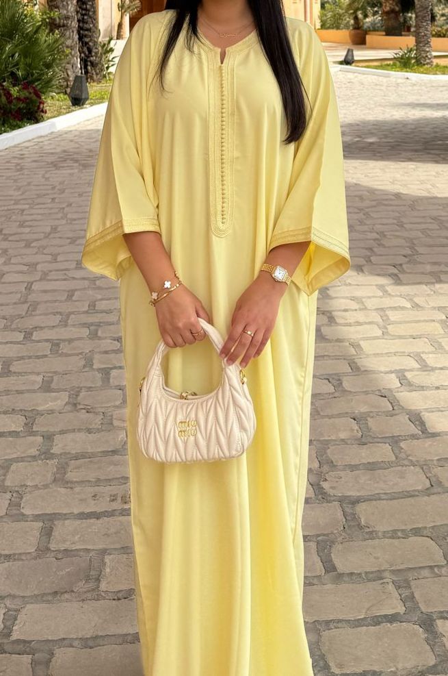 Erleben Sie die Kunst traditioneller marokkanischer Handwerkskunst mit der exklusiven Gandoura „Zina“, was auf Marokkanisch „Schönheit“ bedeutet. Handgefertigt aus feinsten Materialien und in einem sanften Pastellgelb gehalten, verkörpert dieses einzigartige Meisterwerk die Schönheit marokkanischer Traditionen. Jede Gandoura wird mit Liebe und Präzision gefertigt, was sie zu einem echten Unikat macht. Ideal für besondere Anlässe oder elegante Alltagsmomente – „Zina“ bringt marokkanische Raffinesse in Ihre Garderobe und lässt Sie in zeitloser Eleganz erstrahlen.